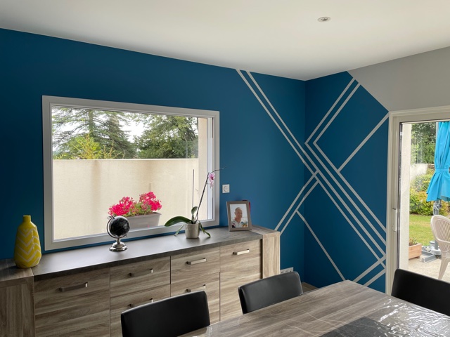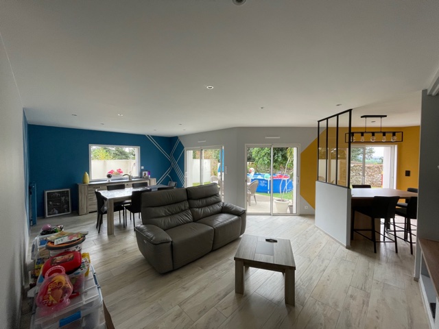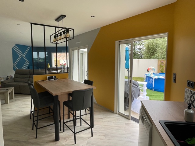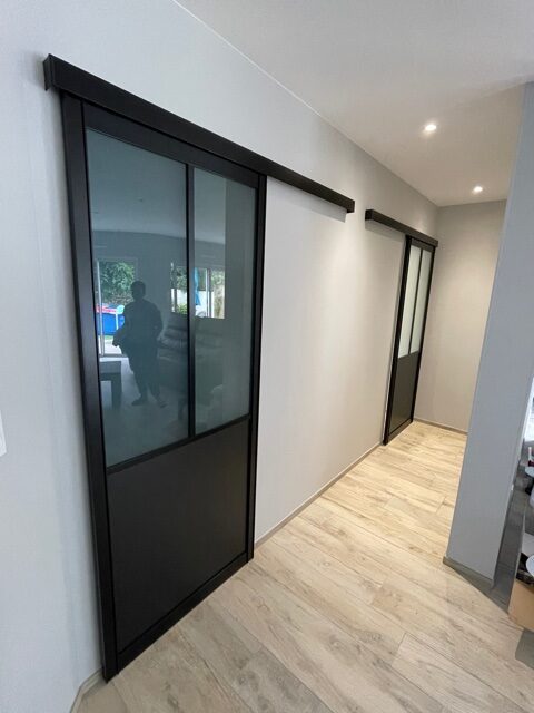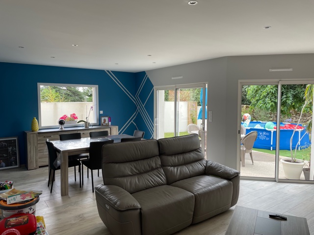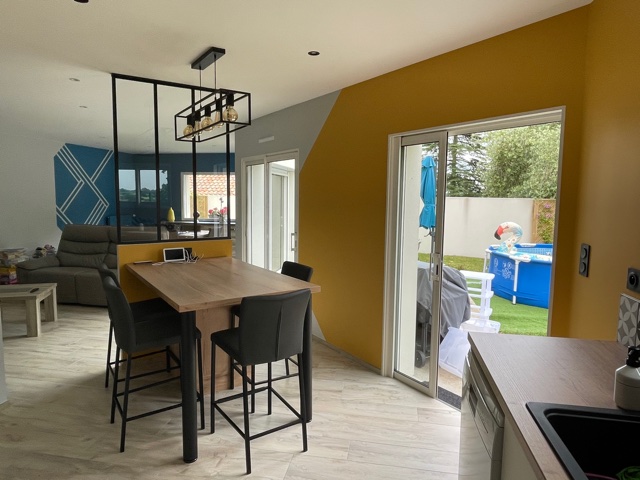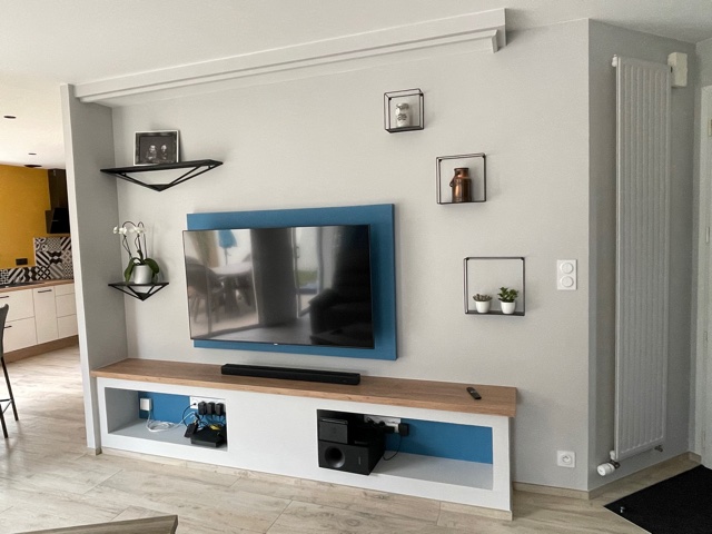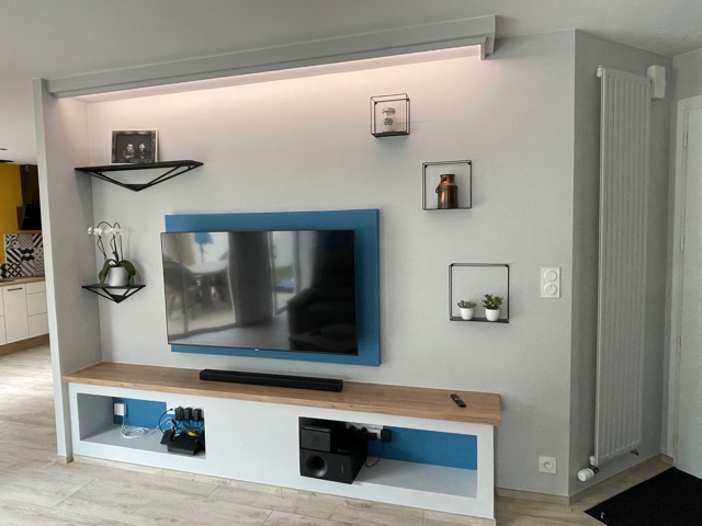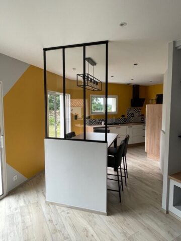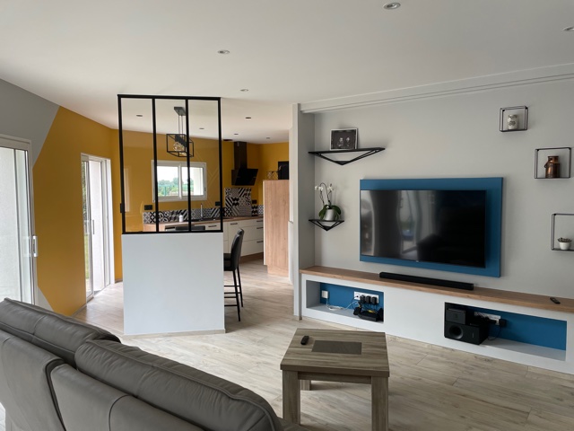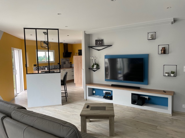 - Pièce de vie : pose d’un nouveau sol, peinture intégrale, installation d’une verrière et création d’un meuble TV sur mesure.