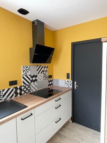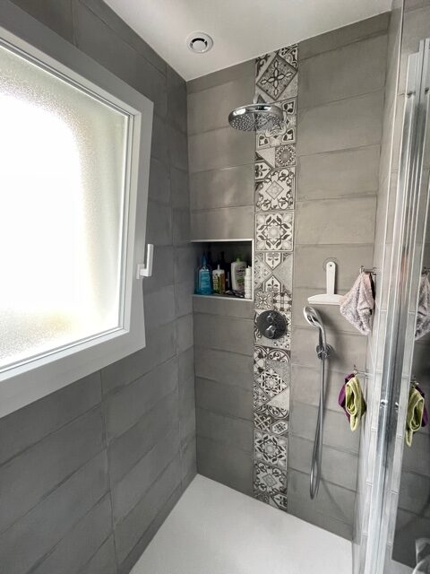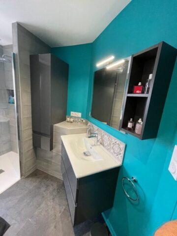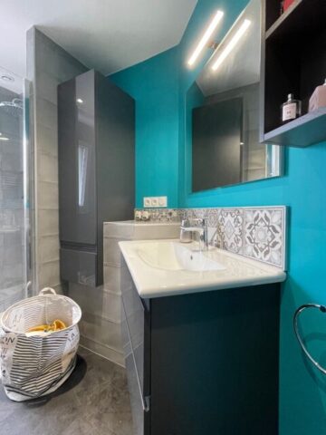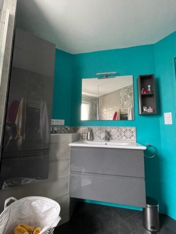 - Salle de bain : rénovation des revêtements, mise en peinture, installation du mobilier et optimisation de l’éclairage.