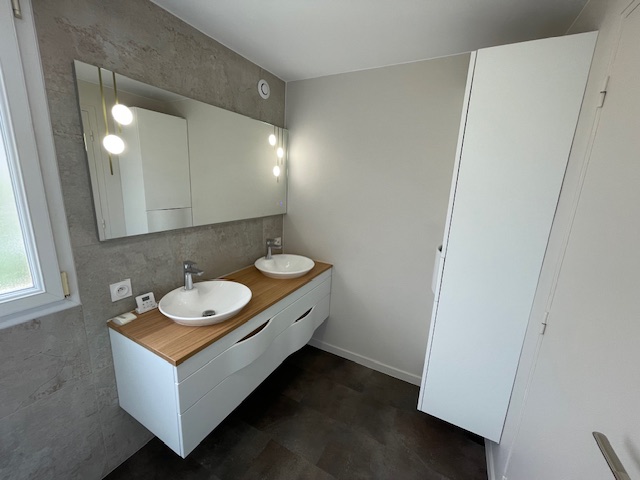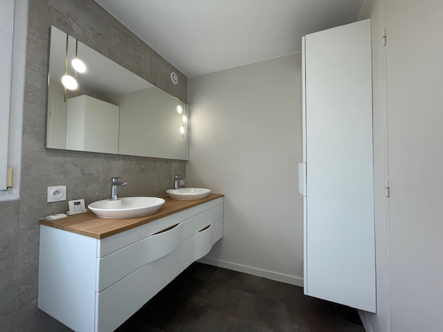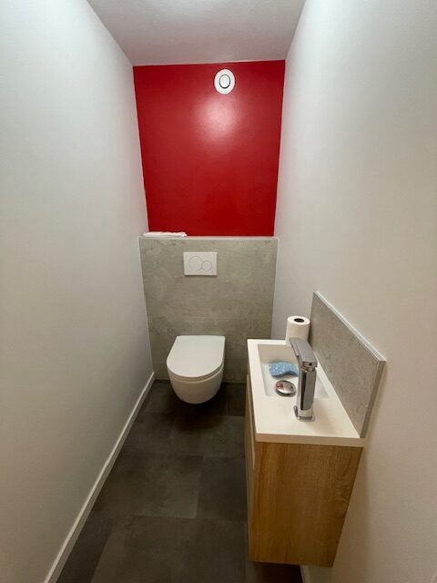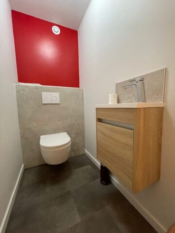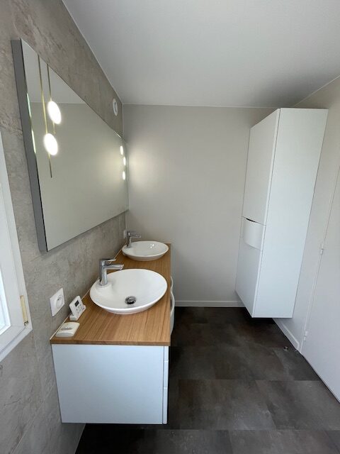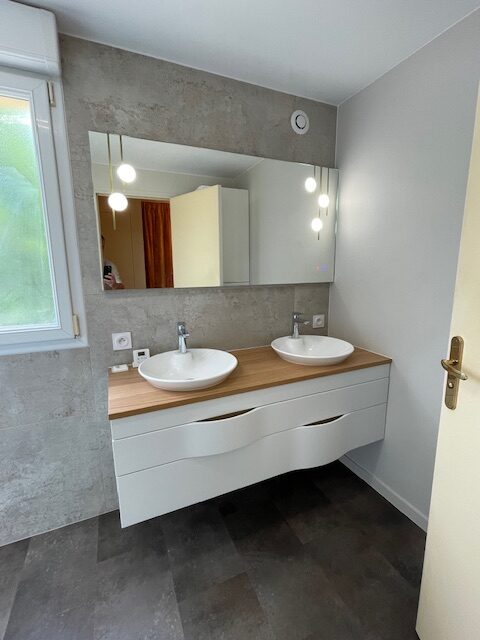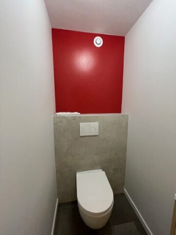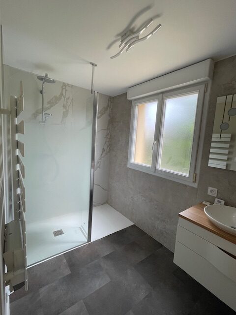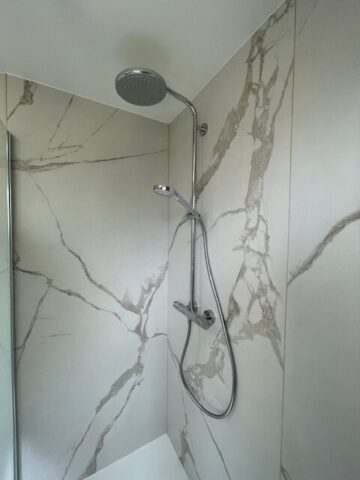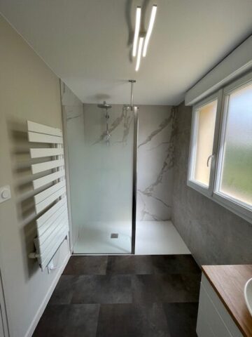 Rénovation salle de bain effet marbre Admirez cette salle de bain rénovée avec un effet marbre raffiné. L’espace principal respire la modernité et le confort.